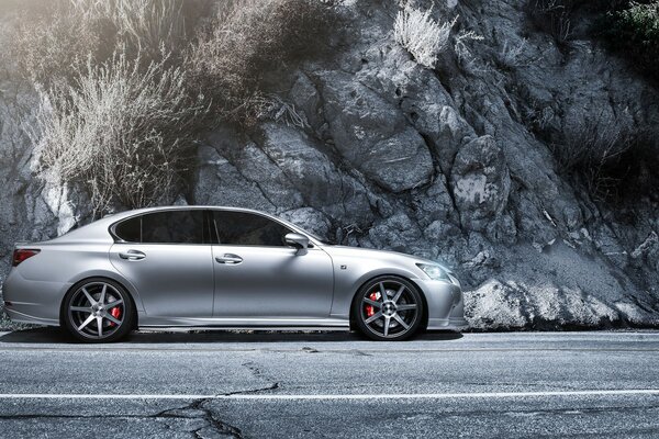 Жартастың жанындағы жолда lexus көлігі