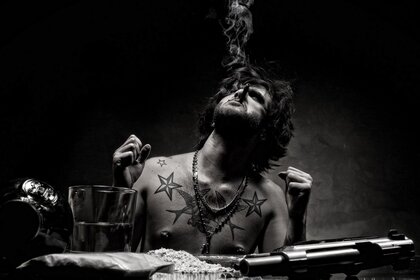 Жұлдыздардың татуировкасы бар темекі шегетін адамның портреті