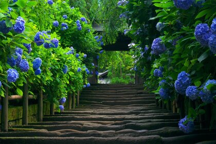 Көк гүлдері бар бұталар шеңберіндегі баспалдақ