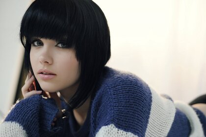 Ұзын шашты брюнетка камераға мәнерлеп қарайды