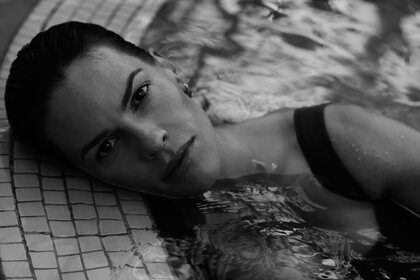 Монохромды фото қыздар бассейнде