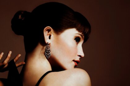 Терең мойын сызығы бар қыз баспалдақта отырады