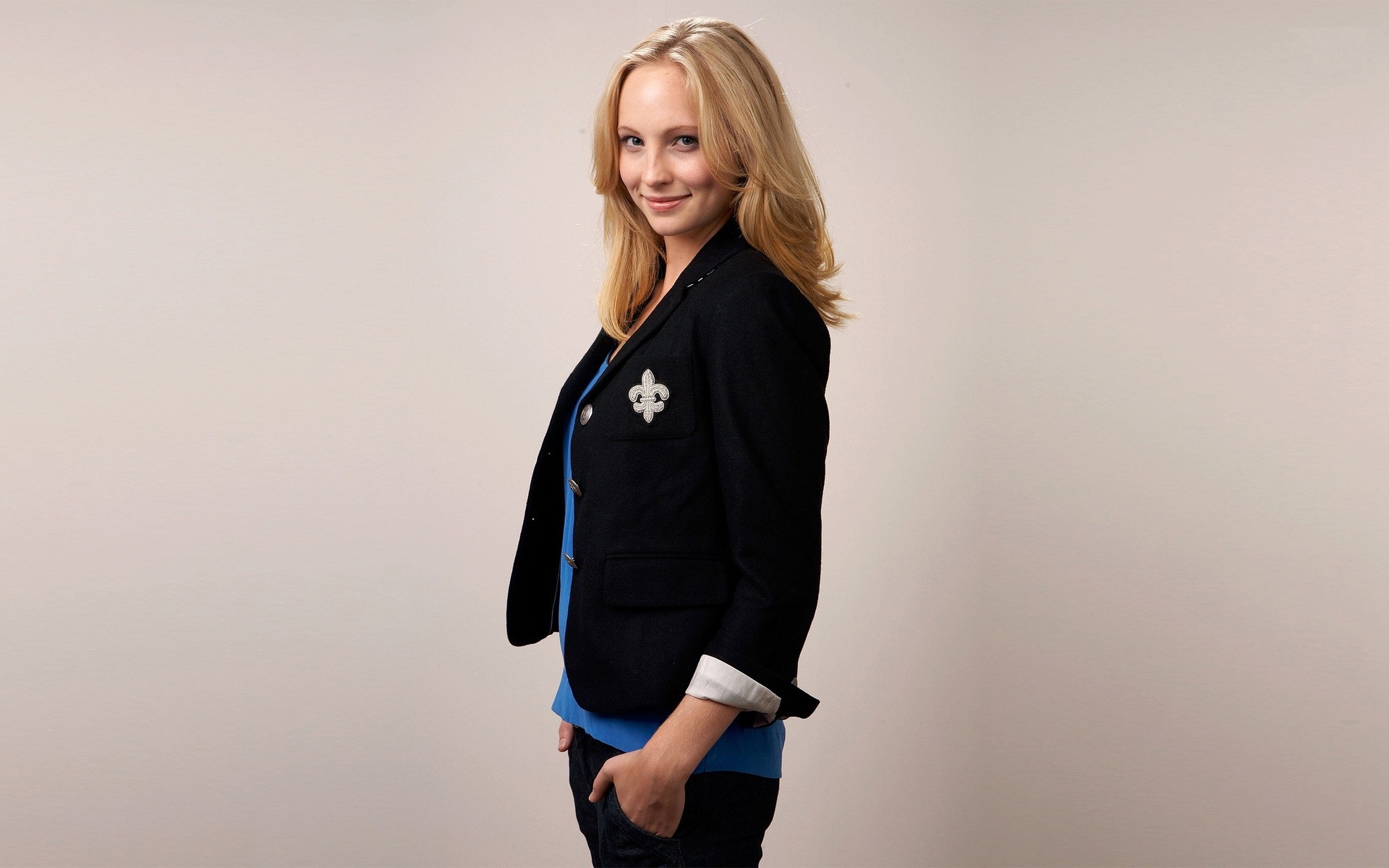 Аққұба қара және көк костюммен суретке түседі