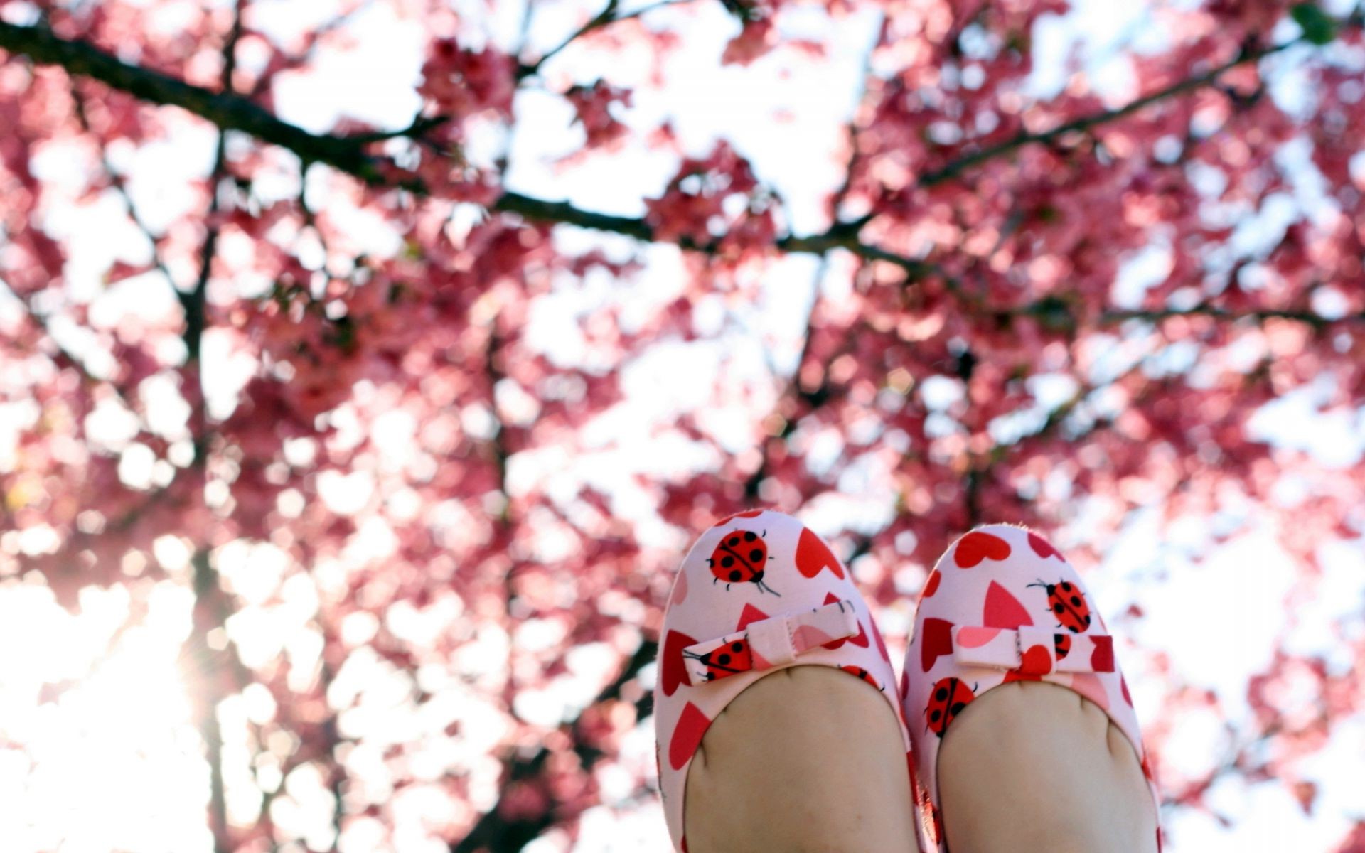 Гүлденген шие фонында аяқ киіммен көтерілген аяқтар