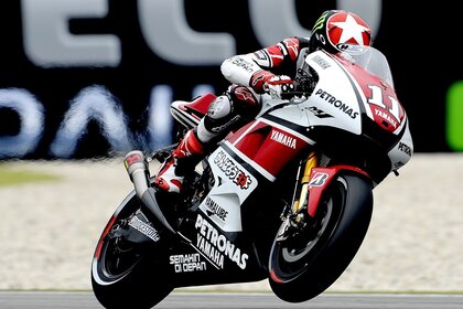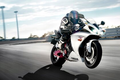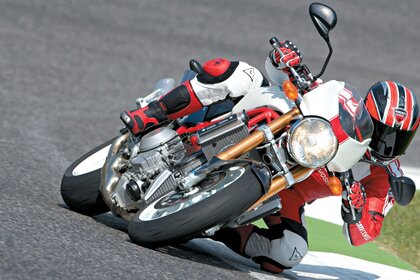 Мотоцикл жүргізушісі бүйіріне қарай қисайып келе жатыр