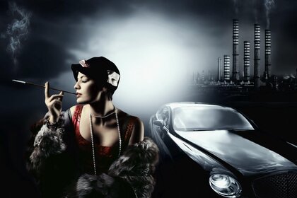 Машина мен зауыт құбырларының фонындағы ханым темекі шегеді