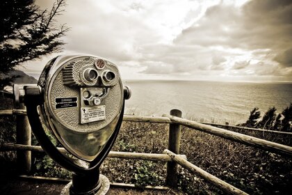 Қоршауда бинокль бар теңіздің монохромды фотосуреті