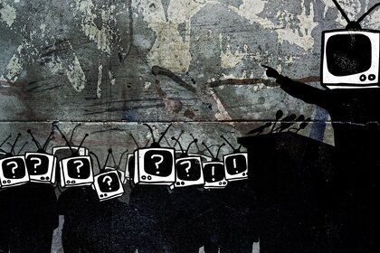 Бастардың орнына теледидарлары бар адамдарды бейнелейтін сұр бетон қабырғадағы граффити