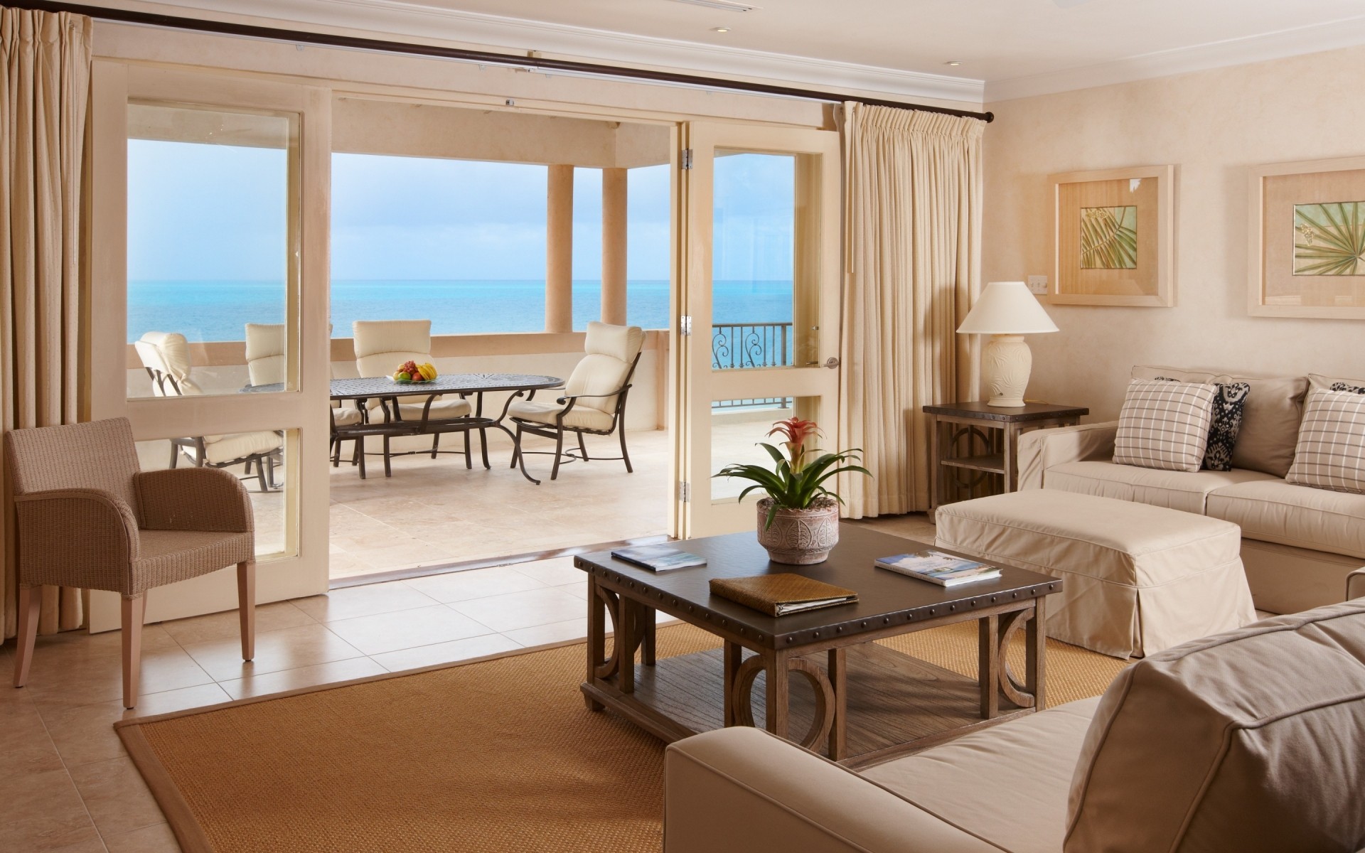 Жарқын қонақ бөлмесінің балконының көрінісі - жұмыс үстелінің тұсқағазы