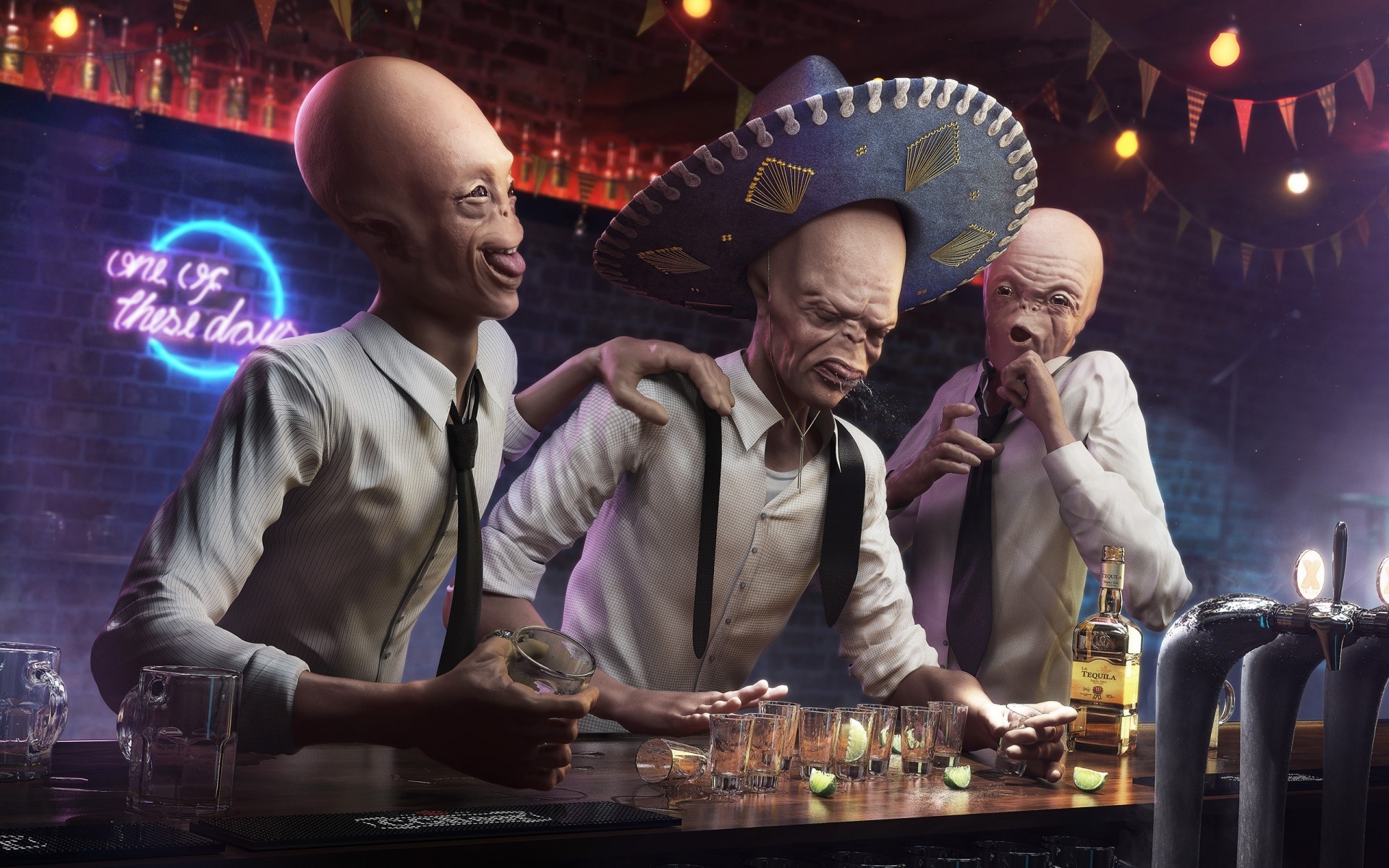Бар астындағы жертөле бөлмесі, онда адамдарға ұқсайтын күлкілі тіршілік иелері бар - телефондағы тұсқағаз
