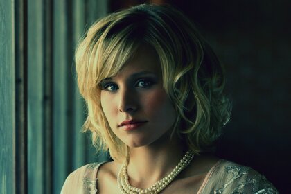 Інжу алқасы және қысқа шаш қиюы бар аққұба қыз