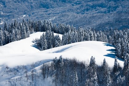 Төбедегі қарлы орман панорамасы