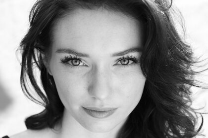 Қара және ақ фонда ұзын кірпіктері бар қыз