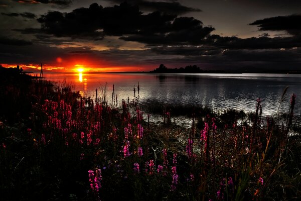 Күн батуы. темнотта қара көк көл