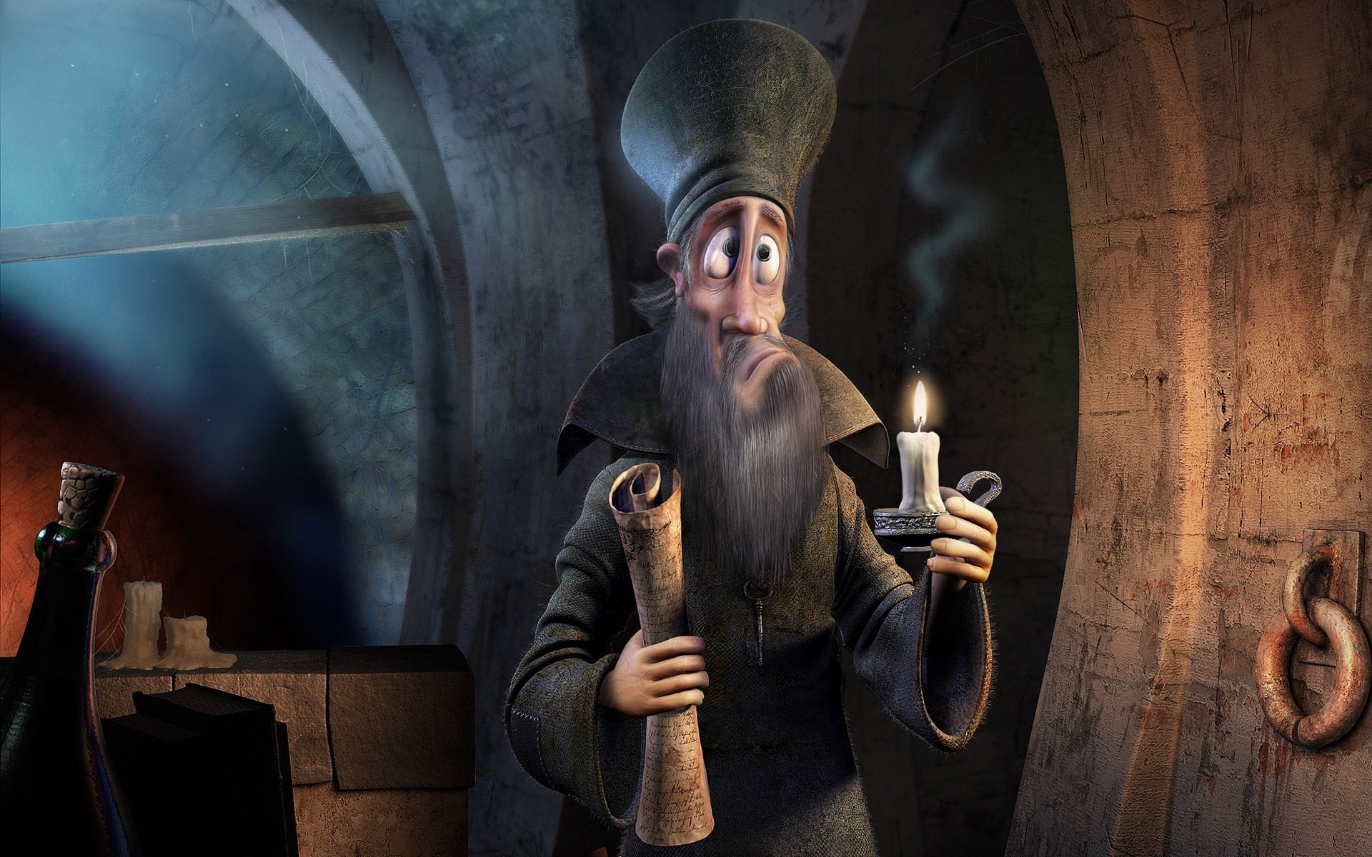 Қолында шам мен қолжазба бар мультфильм шежірешісі