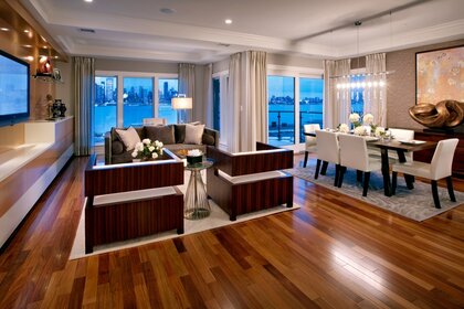 Терезеден әдемі көрінісі бар төсек және жұмыс үстелі бар бөлме