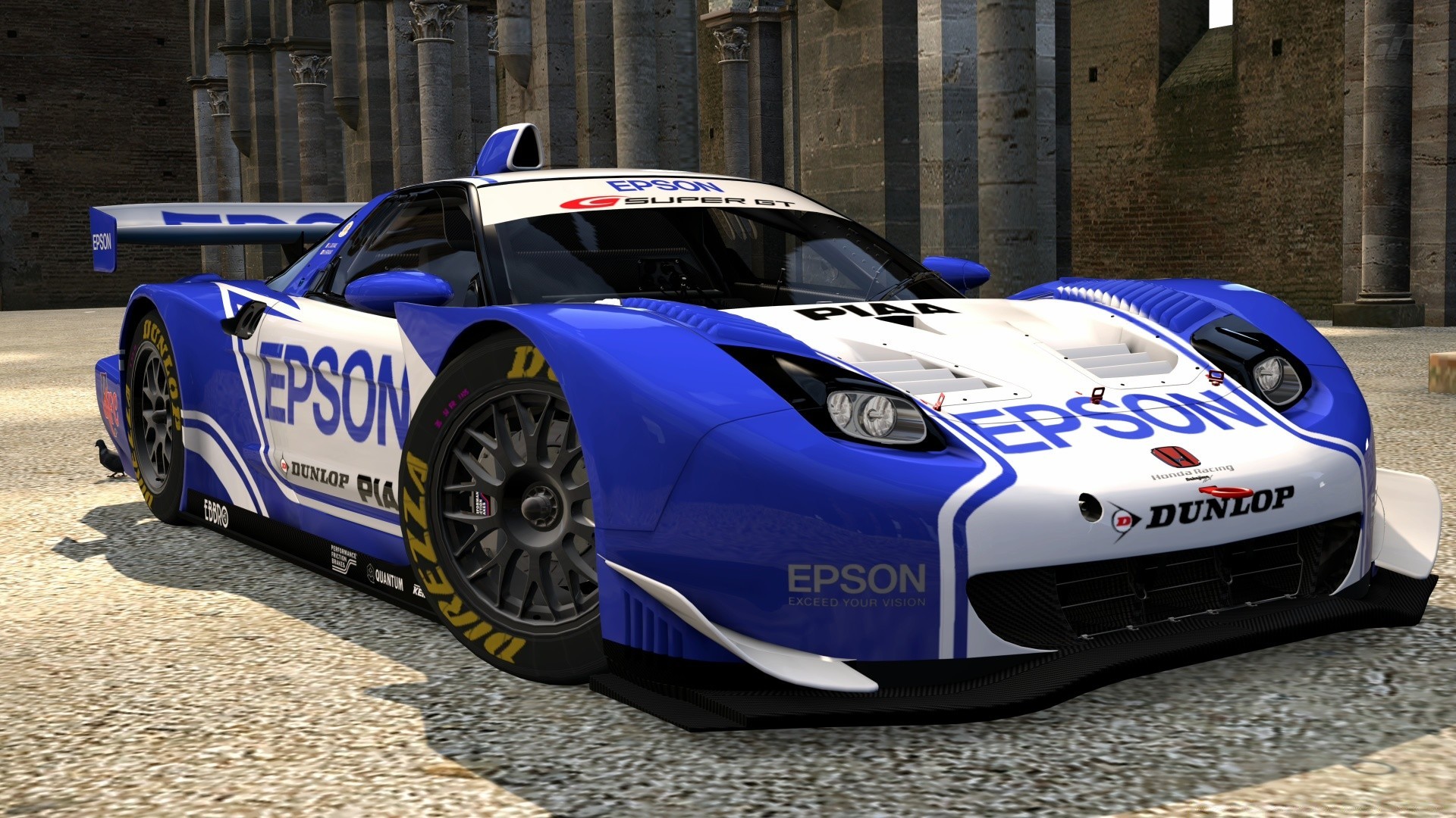 Биік бағаналы ғимараттың жанында көк түсті жарыс машинасы