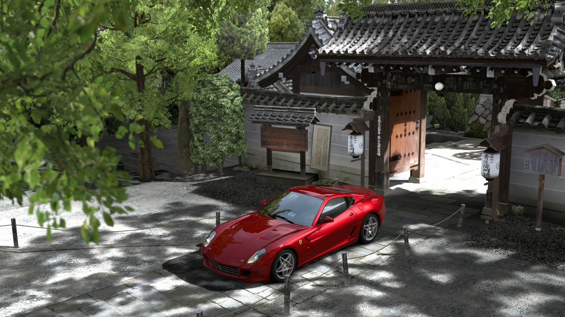 Қызыл жарыс машинасы ашық қақпаның жанында тұр